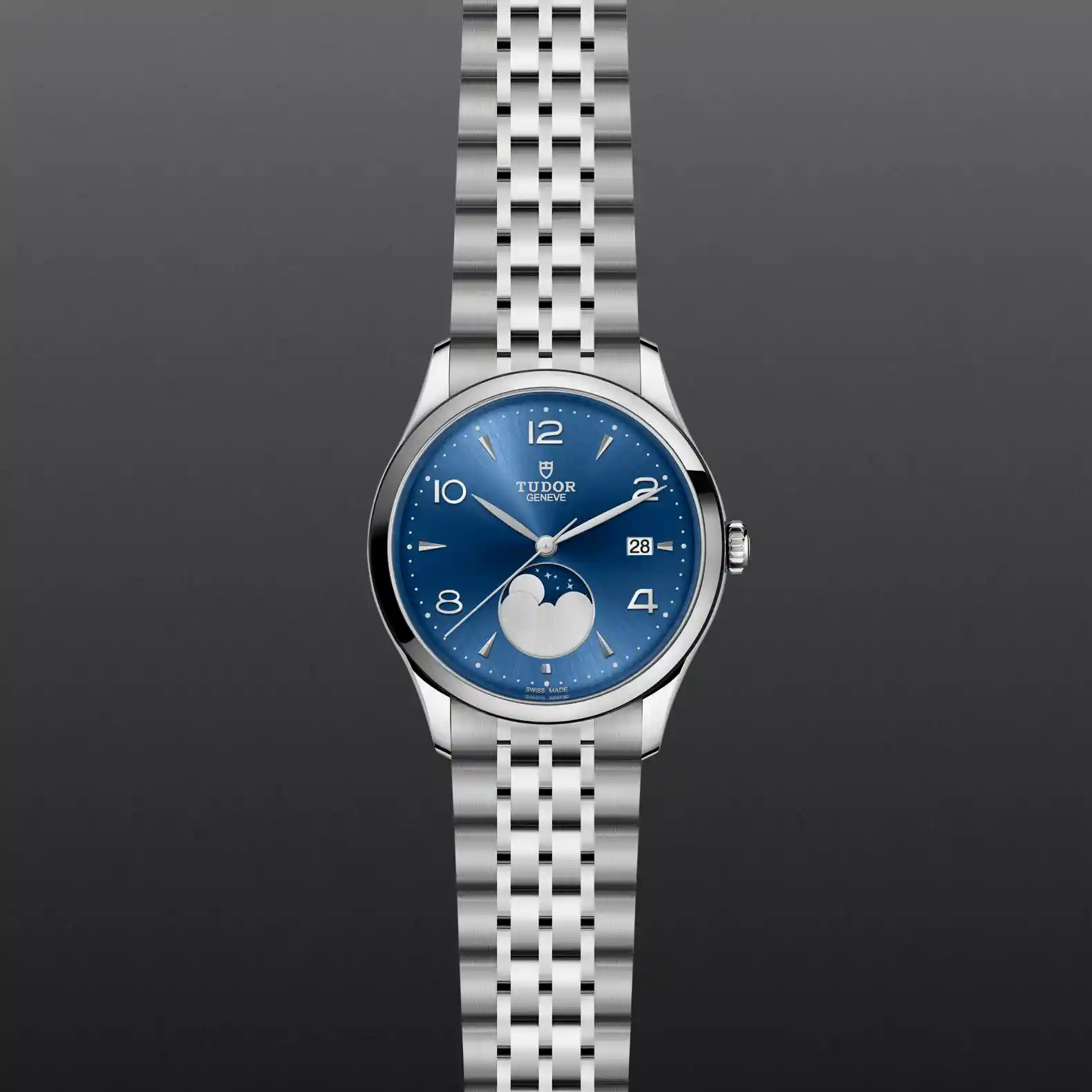 Blue satin sun-brushed dial with applied numerals and moon phase indicator