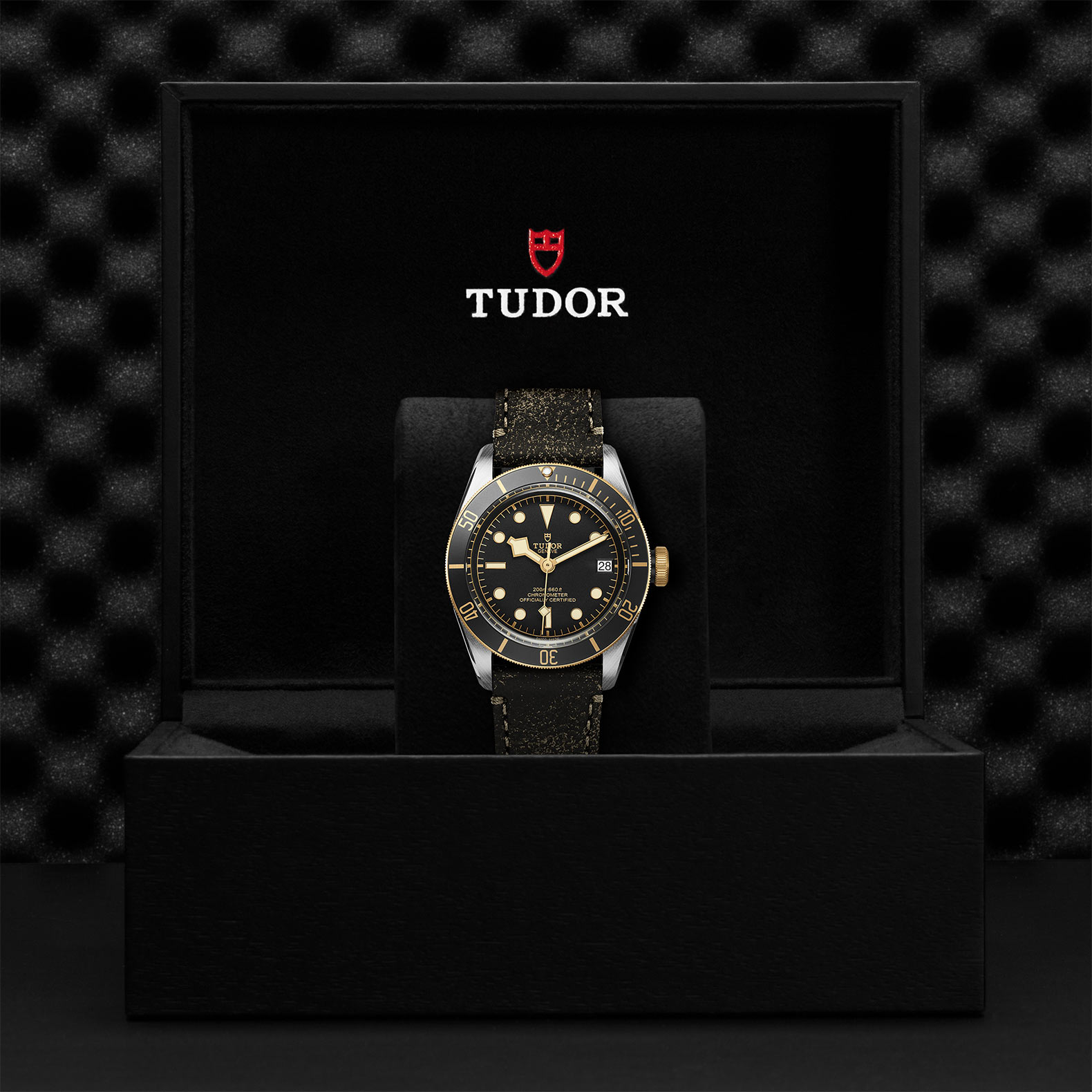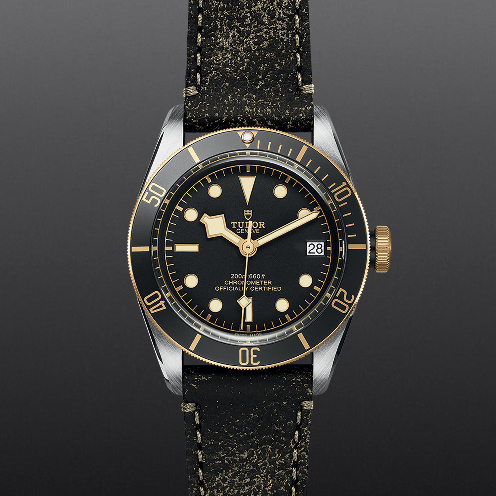 Enhancing the Black Bay with yellow gold creates a version named S&G, for Steel & Gold. Tudor derived the characteristic aesthetic elements of the Black Bay S&G model from its history. The overall shape, as well as the domed dial and crystal, come from the first Tudor divers’ watches. In this version the lines and proportions of the Black Bay are retained, while the rotating bezel and the winding crown are made from yellow gold.