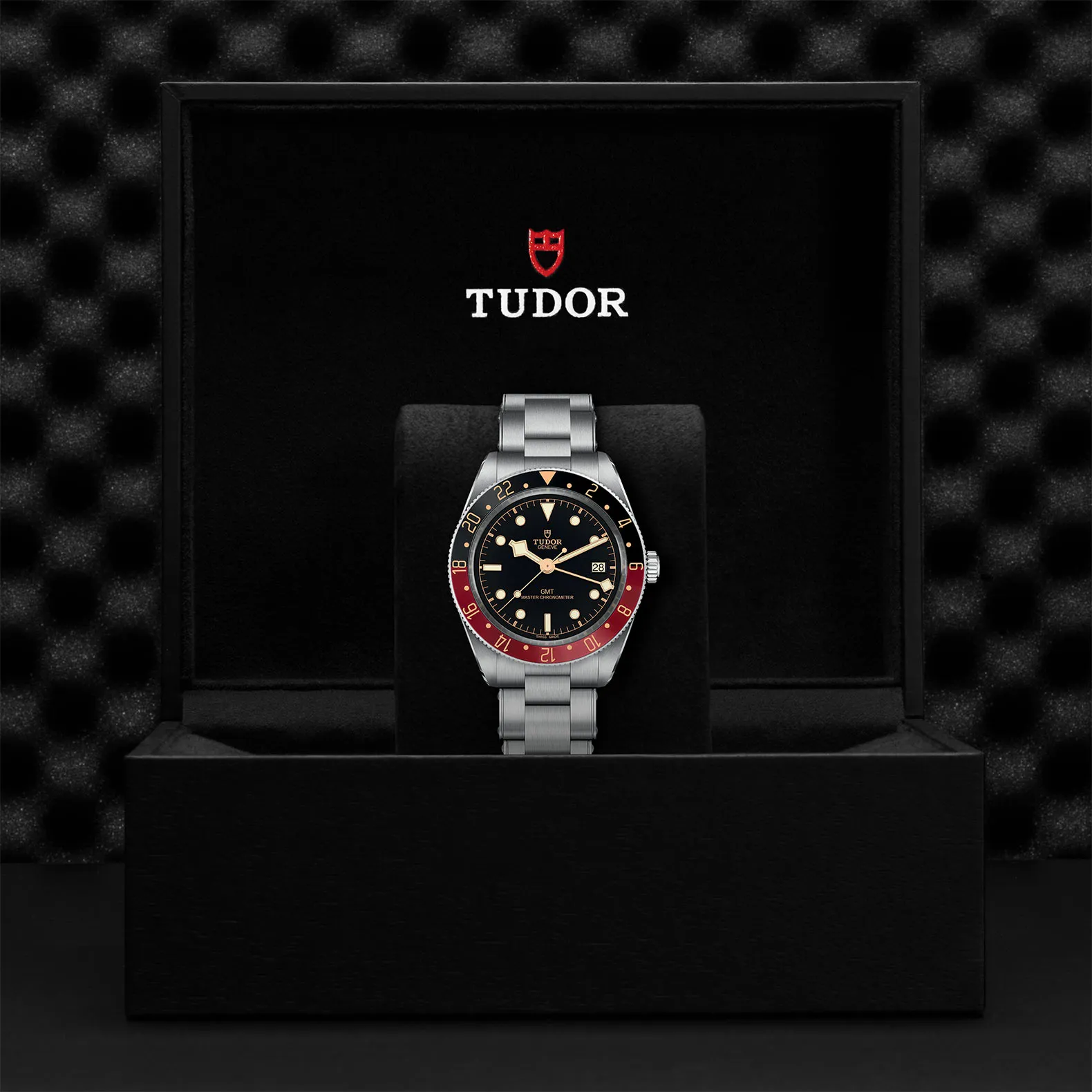 不锈钢三链节“铆钉式”表带,经磨光及磨砂处理,配帝舵表“T-fit”带扣